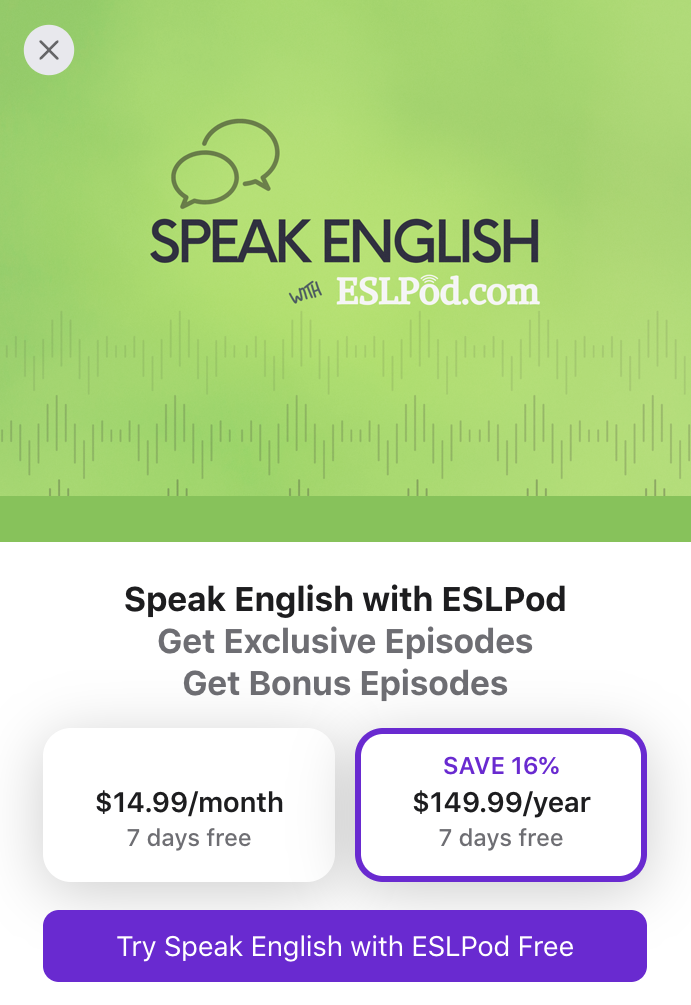ESL Podcastはすべてのエピソードを無料で利用できるわけではありません。