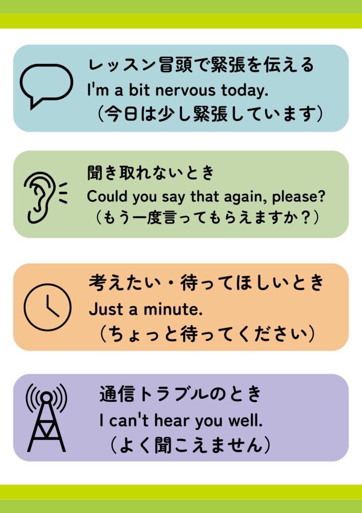 聞き返しや助けを求めるフレーズを手元に置くと、「詰まっても何とかできる」という安心感が生まれます。