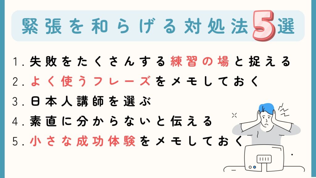 オンライン英会話で緊張する状況を和らげる5つの対処法を紹介します。