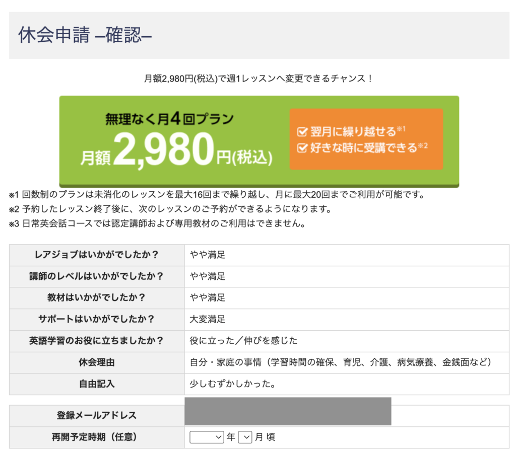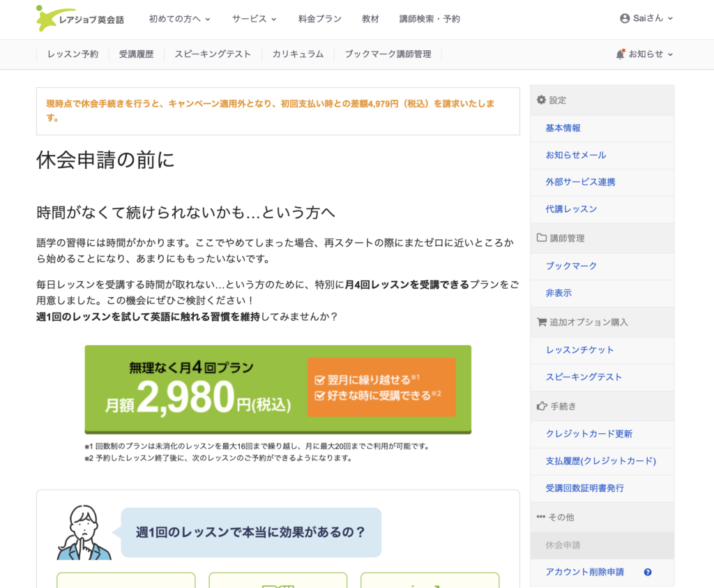 公式サイトの料金一覧には載っていませんが、レアジョブには休会申請をする際に月4回コースの案内が表示されます。