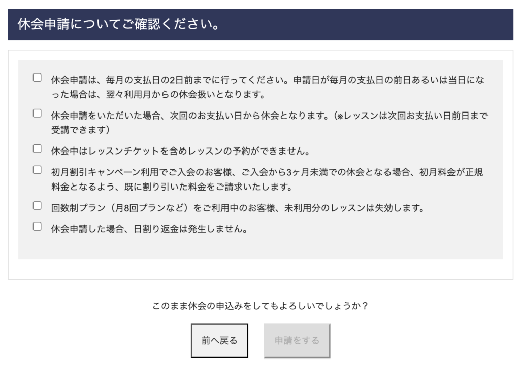 前日に休会申請すると翌々月からの休会になるので注意が必要です。