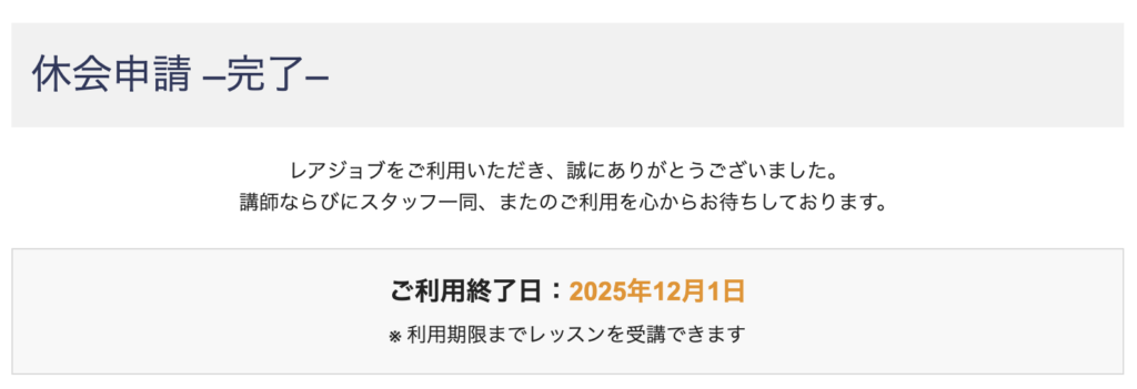 休会とは、レアジョブの利用を一時的に停止することです。休会中は支払いは発生しません。